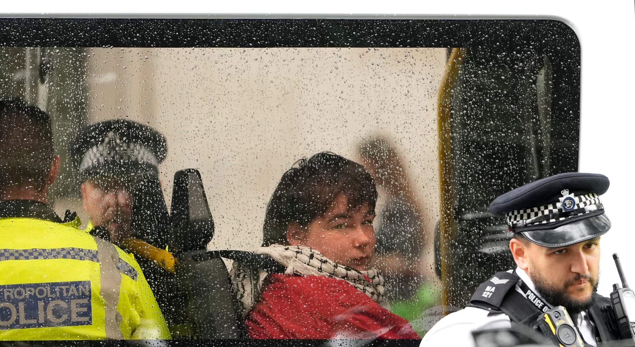 In police vans, demonstration participants were removed, some of them sporting Palestinian scarves in black and white.