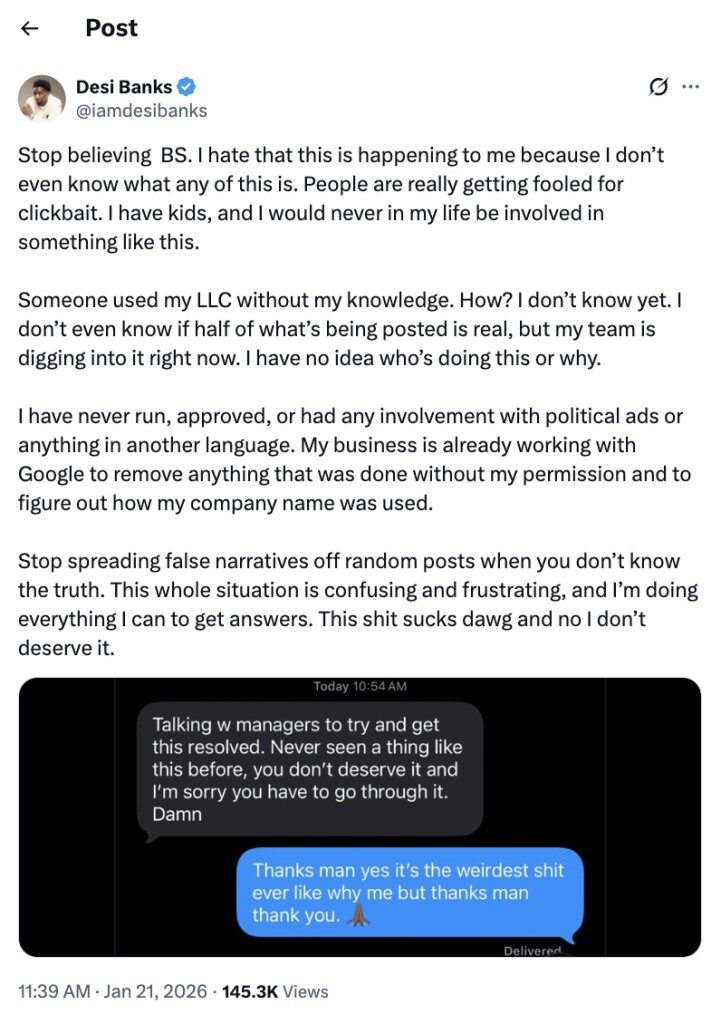 Desi Banks is retaliating after Google acknowledged that it had terminated an advertising account associated with his business due to what it described as “egregious” policy infractions, which sparked wild speculation about a purported devotion to Israel.