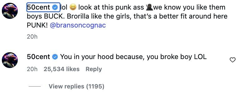 50 Cent continued to share his humor in the comments section. In response to Buck’s challenge regarding walking through Queens, he stated, “You in your hood because you broke, boy LOL.”