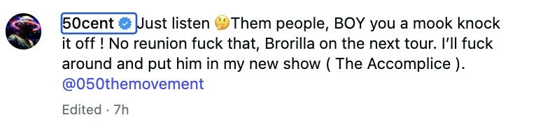 “No reunion,” 50 Cent stated. “Brorilla will be on the next tour.”