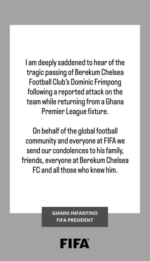 In an official statement, Infantino expressed his profound sorrow over the loss of the 20-year-old attacker, characterizing the circumstances of his death as tragic and distressing. “I am profoundly saddened to learn of the tragic loss of Dominic Frimpong from Berekum Chelsea Football Club, following a reported attack on the team while they were returning from a Ghana Premier League match,” Infantino expressed.